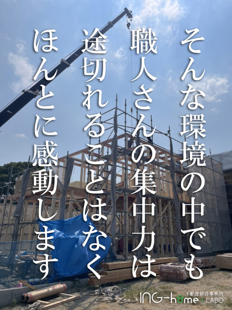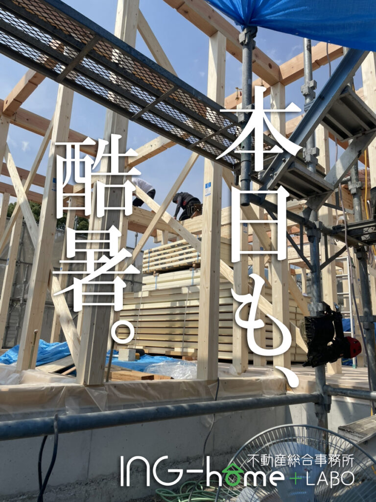 棟梁…かっこよくし過ぎた…(笑)本当に暑い日でした…ほんの少しの油断も命に係わります。そんな状況下でも、気密処理は絶対に怠らない。ありがとうございます。日を改めて上棟式はお盆明けに行わせていただきます。