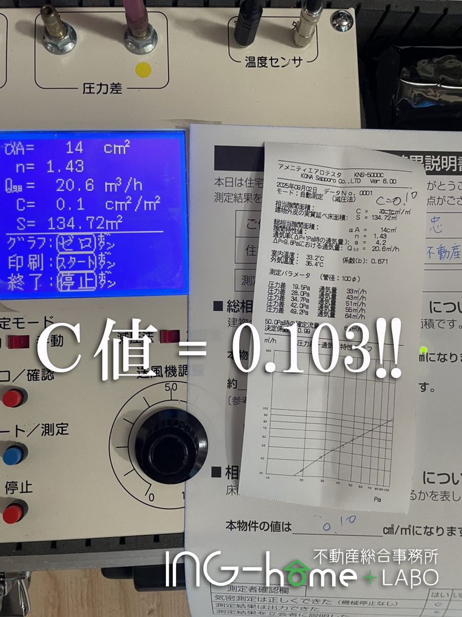 『葛城市T様邸 気密測定 C値=0.103』